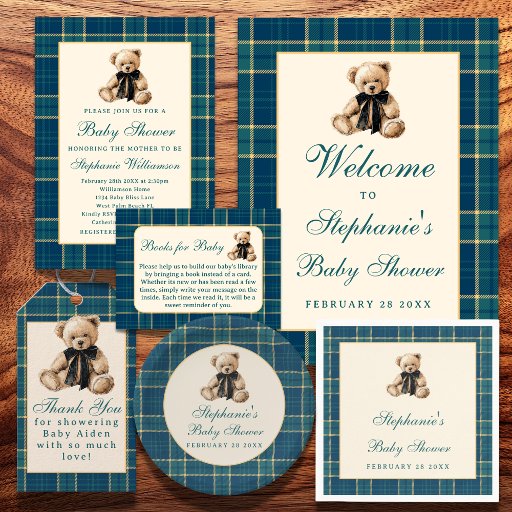 Green Preppy Plaid Vintage Teddy Bear Baby Shower 招待状