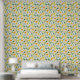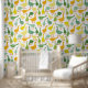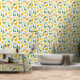 Modern goose wallpaper with lots of green and yellow geese in different poses.