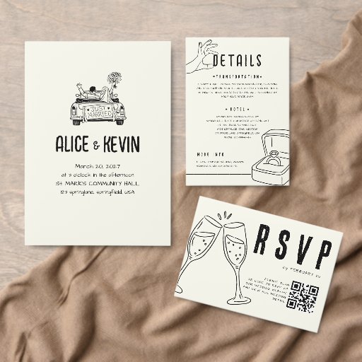 Hand Drawn Illustration Ivory Minimalist Wedding 招待状