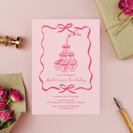Hand Drawn Pink Champagne Tower Birthday Party 招待状