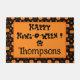 Say Happy Howl-o-Ween to everyone who arrives at your door this spooky season with our personalized dog Halloween welcome mat. Classic orange and black colors and fun typography make this custom Halloween doormat unique! Featuring our cute pumpkins and paws pattern and your name. A seasonal Howloween door mat for dog lovers.