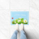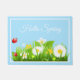 明るい空と青の色の背景と白とハロー縁ど春の文字と美しい花のプリントでDoormatが表示される。色:ライトスカイブルー。こカスタマイズの品買目は