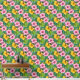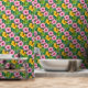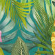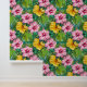 Tropical hibiscus flowers patterned wallpaper. Pink and yellow flowers, with lots of greenery make a seamless diagonal pattern over a blue-green background color.