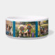 A dog bowl featuring seven breeds of dog dressed like hippies. From left to right, they are pug, poodle, French Bulldog, Dalmatian, Rottweiler, Basset Hound, and boxer.