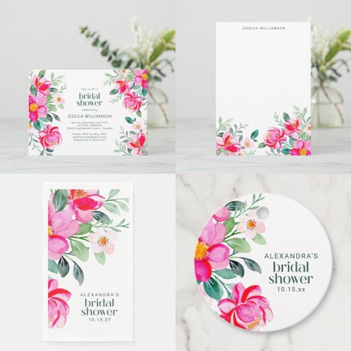 Hot Pink Yellow Watercolor Floral Bridal Shower 招待状