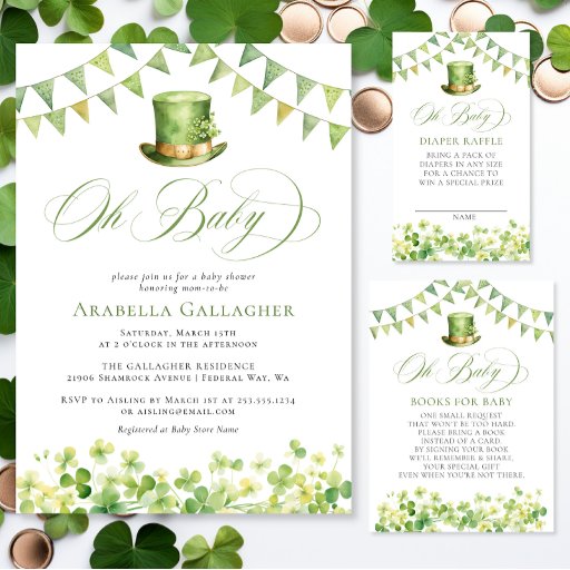 Share your gratitude with these personalized St. Patrick’s Day baby shower thank you cards, featuring soft watercolor shamrocks, festive green bunting, and a charming leprechaun top hat. Designed to coordinate with your Irish-themed baby shower décor, these elegant cards are perfect for thanking guests for celebrating your little lucky charm.