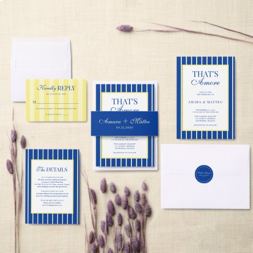 A modern yet timeless wedding reception card featuring light yellow and blue stripes that evoke warmth and sophistication. The design is elevated with blue typography, striking a perfect balance between minimalist clarity and elegant Italian flair. The overall aesthetic whispers old money elegance—refined, understated, and effortlessly chic. The striped palette recalls sunlit Italian villas, while the vintage typography adds a touch of aristocratic charm. Together, these elements create an invitation that is minimalist yet luxurious, romantic yet dignified, and unmistakably Italian in spirit.
