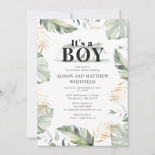 Wild, calm, and elegant boys safari animal baby shower invitation featuring a giraffe, gold effect and green leaves. Perfect for boys baby shower budget invitations
