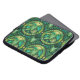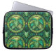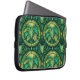 Laptop sleeve with a vibrant green botanical pattern featuring symmetrical fern leaves and circular motifs. Design conveys a fresh and lively tone.