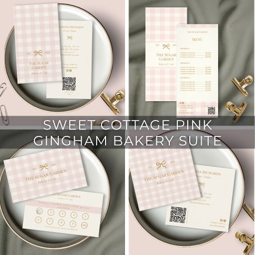 These chic light pink checkered bakery box seal features a pale pink and cream gingham print background with contrasting golden text. Features your business name, website and the phrase "Baked With Love" along with your social media handle. This custom pink bakery packaging sticker perfect for bakers, farm stands and cafes.