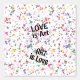 Fun paint splatter watercolor pastels in pink, purple, yellow, orange, blue, and green. Love is art, Art is love typography in black. Keep text or delete.