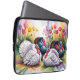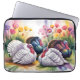 A vibrant, horizontal illustration rendered in a loose watercolor style, featuring a group of four turkeys in a lush field of flowers. Two of the turkeys are traditional white with prominent red wattles, sitting in the foreground. The two background turkeys are stylized with vivid, unnatural colors, displaying deep blues, purples, and rainbow feathers. The background is filled with brightly colored, painterly wildflowers and a soft, blending sky of pinks, yellows, and purples, giving the whole image a cheerful, celebratory, and festive look ideal for autumn or Thanksgiving.
