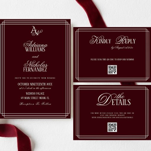Luxury Ivory Burgundy Monogram Wedding 招待状