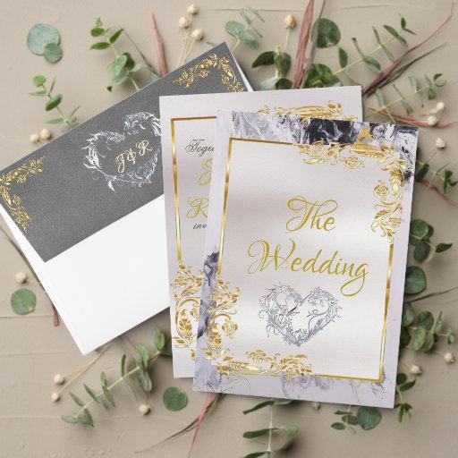 This elegant All In One wedding invitation features a white center on a black and white marble background, framed with gold roses and leaves, embellished with a silver scroll heart. Designed to coordinate with the "Elegant Marble, Gold Leaves Frame & Scroll Heart" Wedding Collection. To change details, click «Personalize». To move the text or change the text size, font, or color click «Click to customize further»