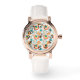 この女性時計は、白い背景にモダン金ゴールド、オレンジ、ターコイズの同心円状のデザインを持っている。