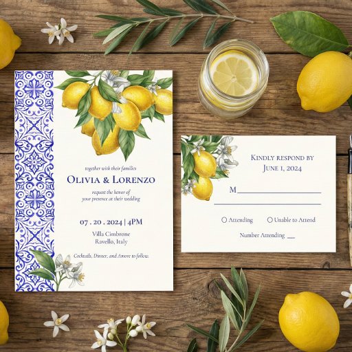 Mediterranean Blue Tile & Lemon Branch Wedding 出欠カード
