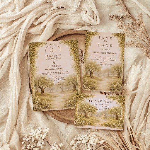 Inspired by sun-washed Mediterranean landscapes, this design features an olive grove countryside scene with winding paths, soft greenery, and warm neutral tones. A timeless, romantic aesthetic ideal for couples drawn to Italian, Tuscan, or Southern European outdoor celebrations with a calm, elegant, nature-focused feel.