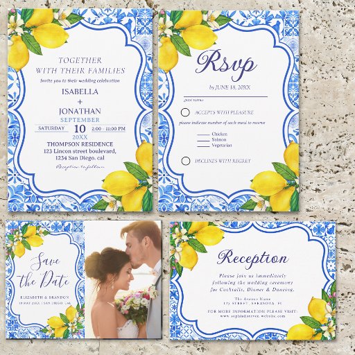 Celebrate your special day with this charming Mediterranean-style wedding design, featuring traditional Italian tiles in light blue and hand-painted watercolor lemons. Perfect for a rustic, coastal, or Amalfi-inspired wedding, this elegant design captures the charm of Southern Italy with its intricate patterns and fresh citrus touches. Fully customizable with your wedding details, this enchanting Italian design adds a touch of Tuscan romance to your celebration. Ideal for destination weddings, summer ceremonies, and Italian-themed receptions. For complementary products, please see the collection of this design.