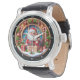 A heartwarming Christmas illustration featuring Santa Claus and a reindeer peeking through a snowy window, surrounded by festive decorations like garlands, candy canes, and ornaments. A sign in front of them reads Merry & Bright. The artwork is presented on a round, silver-toned item with numerical markings around its edge, capturing a cozy and joyful holiday scene.