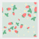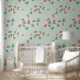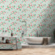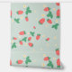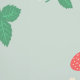 A sweet cute wallpaper that features a delightful and playful pattern of scattered mini strawberries on a sweet, light muted green background. The strawberries are rendered in a vibrant red with green leaves, and they are interspersed with small, delicate white or light yellow strawberry flowers, adding to the charm. The overall impression is cheerful, fresh, and sweet, making it ideal for nursery’s decor and baby, toddler, child rooms.