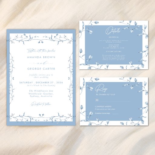 Minimalist Dusty Blue Chinoiserie Floral Wedding 招待状