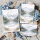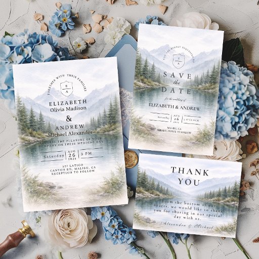 A serene and atmospheric design inspired by misty mountain landscapes and quiet forest scenery. Soft watercolor layers of pine trees and distant hills fade gently into the background, creating depth and a calm, romantic mood. The muted palette of sage green, cool grey, and soft ivory gives the design a refined, nature-driven elegance—perfect for couples drawn to minimalist aesthetics and intimate outdoor celebrations.