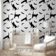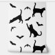 Simple black silhouette pattern of cat and bat silhouettes. One cat is stretching, another is just standing while a third one is reaching toward a flying bat. This design has a modern Halloween aesthetic for those who enjoy a minimal and stylish seasonal look.