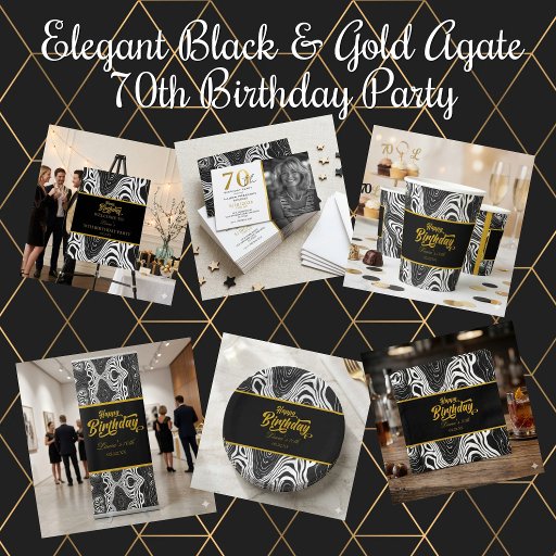 Elevate your celebration with this stylish and modern birthday paper napkin. Designed to complement a chic, contemporary aesthetic, each plate features a striking black and white agate-inspired swirl pattern framing a bold black center. The elegant "Happy Birthday" message is written in a sophisticated gold script, with dedicated space below to personalize it with a name, milestone age, and event date.