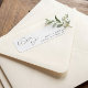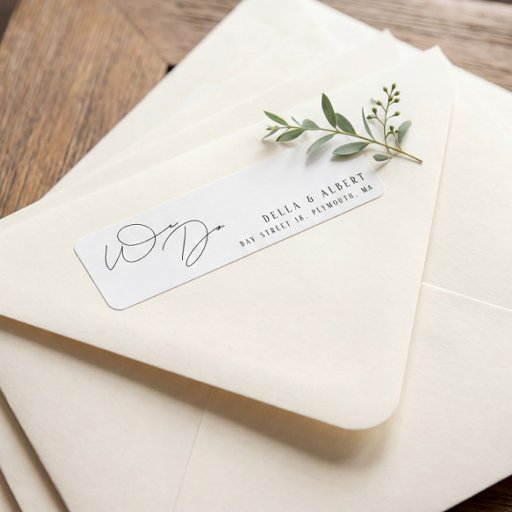 Simple clean minimalist layout and modern calligrapy We Do lettering immediately draw attention to this return address stamp. Edit and personalize this template with your names and address.