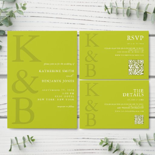 Create your own personalized wedding enclosure cards featuring modern monogram typography and minimalist graphic design in chartreuse color.