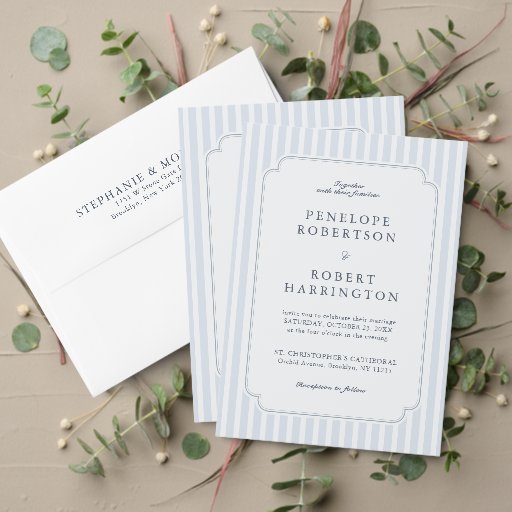 This modern striped wedding invitation features soft dusty blue and slate vertical lines paired with a refined minimalist layout. The elegant curved frame adds a subtle vintage touch while maintaining a clean, classic, and formal appearance. The timeless blue and white palette makes it ideal for church weddings, outdoor garden ceremonies, coastal celebrations, or traditional receptions.