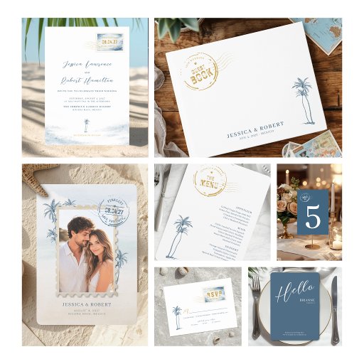 Elevate your table setting with this modern, travel-inspired wedding menu featuring a distinctive postage stamp design. A refined stamp detail highlights the couple’s names, creating a unique focal point that ties beautifully into a destination or travel-themed celebration.