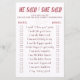 Test how well guests know the couple with this fun He Said She Said Bridal Shower Game. Guests read each statement and guess whether the bride or groom said it. It’s a simple and entertaining activity that gets everyone laughing and involved. Perfect for bridal showers, bachelorette parties or wedding celebrations. Personalize the design to match your event theme and create a memorable moment for the bride and guests.