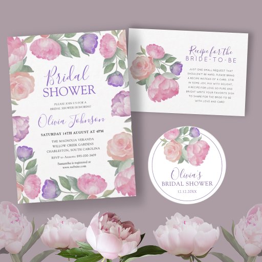 Add a polished finishing touch to your bridal shower stationery with this romantic watercolor floral envelope sticker. Featuring soft blush peonies, delicate greenery, and elegant purple typography, this round design is perfect for sealing invitations, decorating favors, or elevating gift packaging. Ideal for garden party, spring, or feminine bridal showers, it ties your entire celebration together with a cohesive and refined look.