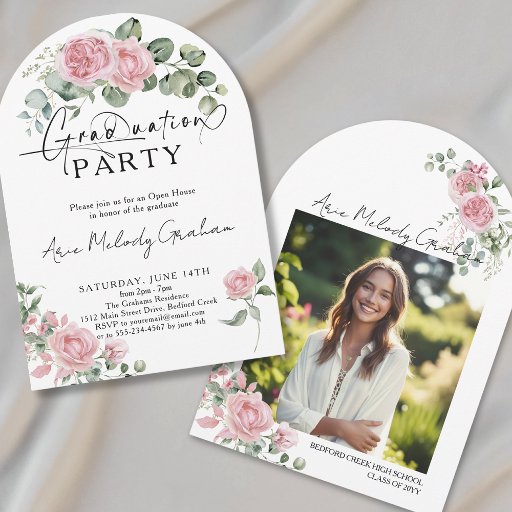 Inspired by a summer rose garden, this graduation party invitation insert/enclosure card features soft blush roses that create a beautiful blend of classic romance and modern typography. Add this card to your invitation suite to share important details your guests may need, such as the event schedule, parking information, accessibility details, weather plans, food and beverage information, dress code, and more.