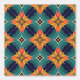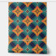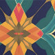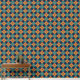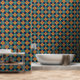 This wallpaper design features a striking geometric star motif in vibrant shades of orange, teal, navy blue, and gold. The repeating symmetrical pattern creates a bold, retro-inspired look that adds energy and personality to any space.