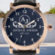 Create your own custom brand luxury watch. Timeless elegant watch dial design with fine indexes. Add your own custom monogram, custom name, designer name, initials, year of birth, logo, icon, photo image, etc. Sophisticated presence of modern minimalist style with elegant script typography template. Luxurious watch for him. Make it a cool new gift for boyfriend, boyfriend, dad, father, husband, brother, son, boyfriend, grandpa, grandpa, grandfather, stepdad, uncle, coworker, employee, company boss, business partner, colleague, best friend, teacher, coach or retiree. Unique monogrammed gift ideas for men's birthday, graduation, anniversary, retirement, vacation, wedding party, appreciation, employment, work, etc. Large diameter about 44mm. Classic vintage style with 22mm fashion black leather wrist strap. White or custom background color. Perfect for 20th, 30th, 40th, 50th, 60th, 70th, 80th, 90s celebrations. Affordable quartz watches under $100. Nice for casual daily wear and special occasions. Also available for other models with brown leather or steel bracelet.