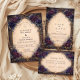 An elegant fusion of gothic romance and baroque refinement, this design features rich plum and deep violet roses paired with muted blue-grey foliage, all woven into an ornate antique gold frame. The softly aged parchment center glows against the dark, textured background, creating a sophisticated contrast that feels both intimate and dramatic. Balanced floral clusters and intricate detailing give the composition depth without overwhelming the layout, making it perfect for a refined, moody celebration with a touch of old-world charm.