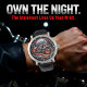 This striking watch face showcases a custom motorcycle engulfed in dynamic orange and red flames, tearing down a road under a dramatic full moon. The dark, cloudy night sky and distant pine trees create an intense backdrop. Silver numbers and watch hands complete this bold design, appealing to motorcycle enthusiasts and lovers of dramatic art.