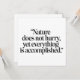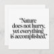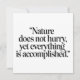 Ce design élégant présente la sagesse intemporelle de la citation "Nature does not hurry, yet everything is accomplished" (La nature ne se précipite pas, pourtant tout s'accomplit). Avec sa typographie raffinée en noir et blanc, ce message profond rappelle la puissance de la patience et l'harmonie des processus naturels.