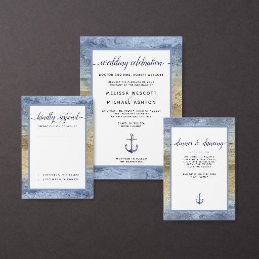 Boutique 航海の Co.のネイビエレガントーと航海の金ゴールドの水の色の招待スイートと結婚の計画デザインは、スタイリングと特徴の要素に基づい伝統的ている。このデザインは、ウェディング航海のとヨットクラブフォーマルボールなどの他のイベントの両方に適している。#Nautical #Wedding #Events #InvitationSuite