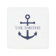 Personalized nautical design featuring a navy blue anchor with your custom family name in a classic serif font.