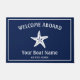 スタイル航海の「Welcome Aboard Aboard」ボートマット。紺色の背景には白縁ど色、中央にはヒトデの白いイメージ。上の白いモダンタイポグラフィは「ウェルカムアボード」で、その下には船の名カスタマイズ前とロケーションを簡単に使える。