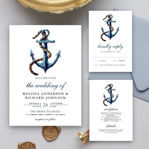 Elegant nautical theme wedding welcome sign featuring a watercolor painted anchor and rope with modern typography.