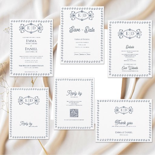 Navy Blue Heirloom Crest Wedding Invitation | Elegant Monogram Formal Traditional Wedding Invite .