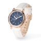 personalized watch, navy blue dial, gold watch, white leather strap, elegant wristwatch, monogram gift, luxury accessory, custom initials, timeless design, stylish fashion
