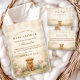 A charming countryside design featuring a fluffy calf, a sweet little lamb, and tiny yellow chicks nestled among soft meadow wildflowers. The warm parchment background and muted earth tones create a cozy, rustic atmosphere with a gentle storybook feel. Delicate greenery frames the layout while the farm animal illustration adds warmth and personality. Perfect for a neutral rural-themed celebration with classic farmhouse charm.