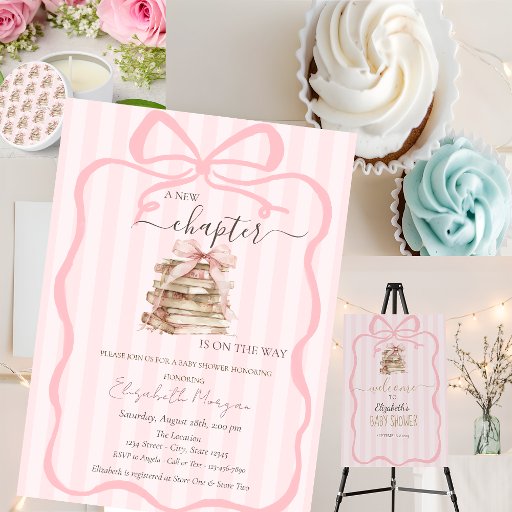 Books with pink bow on pink striped background. A perfect way to invite your loved ones to your special day! Easily personalize the event details for a sweet and stylish touch.