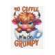 A funny and sarcastic colorful design showcases an adorable highland cow perched in an empty coffee cup. With a grumpy expression, big blue eyes, and brown fur, the cow adds a charming touch. The vibrant text reads, "No coffee much grumpy." This design is featured on a variety of products, making it a perfect gift for coffee enthusiasts.