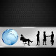 銀色の金属リボンを持つ黒いカーボンの背景に、世界の隣で集まるビジネスの人々のシルエットエレガント。